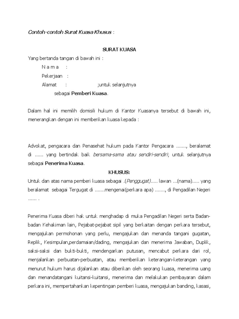 Contoh surat kuasa khusus adalah surat penunjukan untuk mewakili di pengadilan. Contoh surat kuasa khusus tergugat. Richard, direktur utama, bertindak untuk dan atas nama pt. Contoh surat kuasa khusus tergugat. Dengan demikian isinya menjelaskan secara terperinci tindakan apa saja yang bisa dilakukan penerima kuasa terkait dengan penunjukannya tersebut.