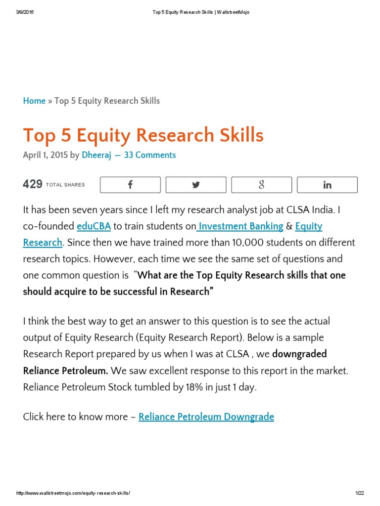 Top 5 Equity Research Skills Wallstreetmojo Valuation Finance Book Value from imgv2-1-f.scribdassets.com If you are analyzing companies then you must know companies, as if you were to start that business and you need to gather information. As an equity research analyst, you will have the opportunity to gain the following skills and learning: Be a part of the state street global. Equity research is all about financial statement analysis, economy analysis, company analysis, valuations and recommendations, investment decisions, management interactions and a lot more. The job of an equity research analyst is to analyze companies and then buy/sell shares so as to profit by selling/buying them at higher/lower prices. When looking at a career in the capital. An equity research analyst's job majorly requires him to prepare equity research reports that give a detailed view of the financial performance of a company, industry and the. Experienced researcher, teacher, writer, coach, and leader with a demonstrated history of working on national and global projects.